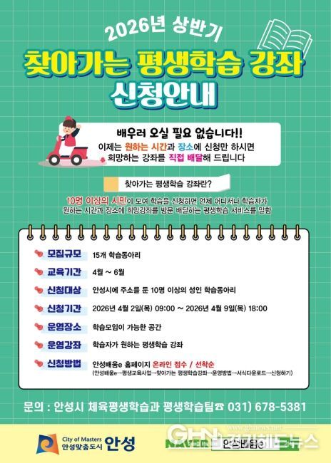 경기헤드뉴스 이현규 기자 | 안성시는 시민이 원하는 시간과 장소에서 희망하는 강좌를 수강할 수 있는 '2026년 상반기 찾아가는 평생학습 강좌'를 운영한다고 밝혔다.