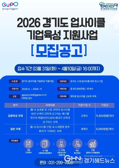 경기헤드뉴스 성미연 기자 | 경기환경에너지진흥원이 업사이클 기업을 발굴해 기술 고도화와 사업화를 돕는 ‘경기도 업사이클 기업육성 지원사업’ 참여기업을 10일까지 모집한다.