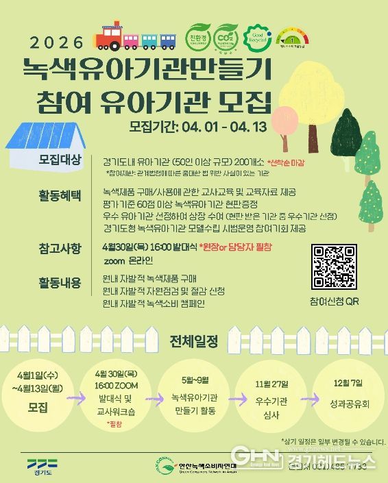 경기헤드뉴스 성미연 기자 | 경기도가 아이들이 생활 속에서 올바른 녹색 소비 습관을 가질 수 있도록 돕는 ‘2026년 녹색유아기관만들기’ 참여 기관 200곳을 4월 13일까지 모집한다.