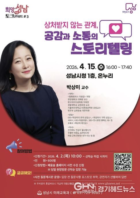 경기헤드뉴스 권준형 기자 | 성남시는 오는 4월 15일 오후 4시 시청 1층 온누리에서 ‘상처받지 않는 관계, 공감과 소통의 스토리텔링’을 주제로 한 명사 초빙 강연을 연다.