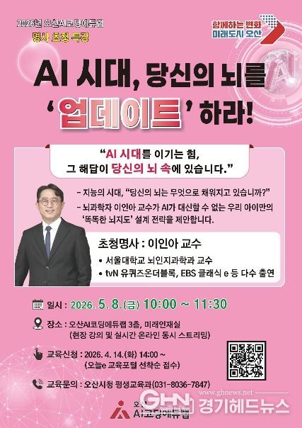 경기헤드뉴스 임수연 기자 | 오산시는 오는 5월 8일 오전 10시 오산AI코딩에듀랩에서 『AI시대, 당신의 뇌를 ‘업데이트’하라!』를 주제로 명사 초청 디지털 AI 시민 특강을 개최한다고 밝혔다.