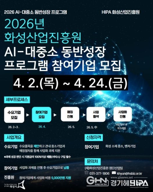 경기헤드뉴스 임수연 기자 | 화성산업진흥원(원장 전병선)은 대기업과 관내 중소기업 간의 상생협력 지원을 위해 공급가치사슬 전체의 경쟁력 향상을 위해 오는 4월 24일까지 ‘2026년 AI-대중소 동반성장 프로그램’ 참여기업을 모집한다.