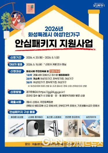 경기헤드뉴스 임수연 기자 | 화성특례시는 범죄 대응에 취약한 여성 1인가구 등 사회적 약자의 안전한 생활을 지원하기 위해 ‘2026년 여성1인가구 안심패키지 지원사업’을 추진하고 대상자를 모집한다고 밝혔다.