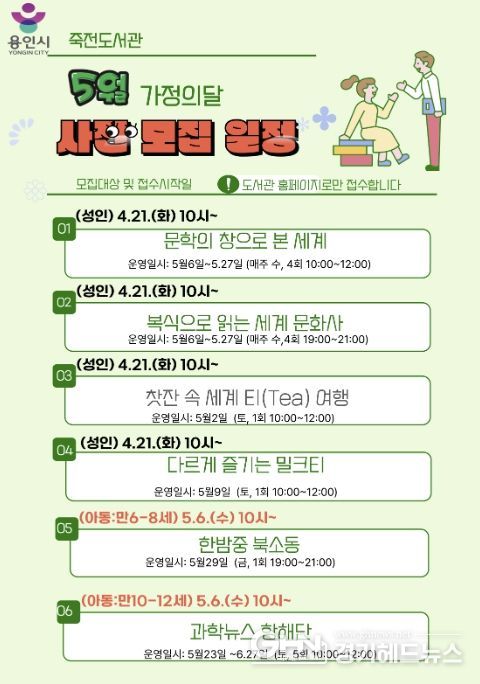 경기헤드뉴스 성미연 기자 | 용인특례시 죽전도서관은 오는 5월 가정의 달을 맞아 ‘2026년 5월 독서문화행사’를 개최한다.