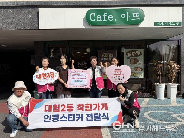 경기헤드뉴스 임수연 기자 | 오산시 대원2동은 지난 16일 지역 내 카페 ‘아뜨’를 ‘착한날개(착한가게)’ 14호점으로 지정하고 인증스티커를 전달했다고 밝혔다.