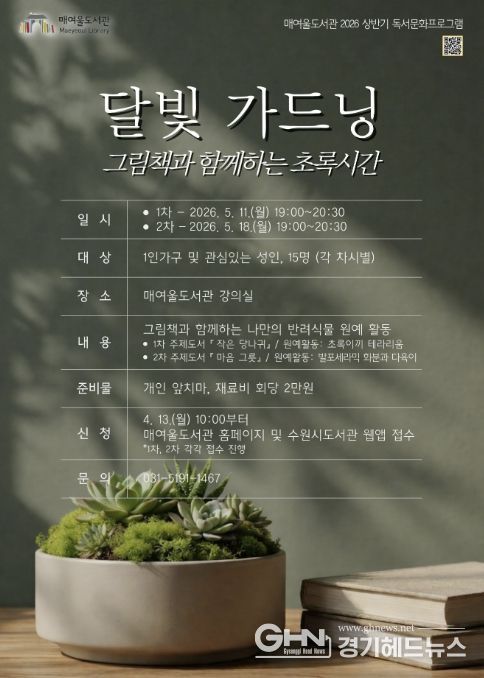 경기헤드뉴스 권준형 기자 | 수원시 매여울도서관이 그림책 읽기와 식물 가드닝을 결합한 체험형 프로그램 ‘달빛 가드닝, 그림책과 함께하는 초록시간’을 운영한다.