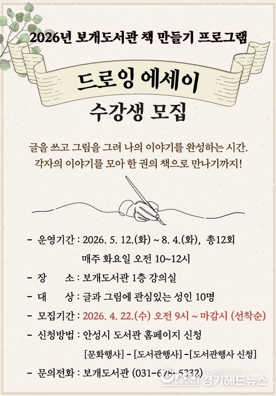 경기헤드뉴스 이현규 기자 | 안성시 보개도서관(책문화센터)이 시민들의 창작 활동을 지원하고 일상 속 예술 경험을 확대하기 위해 오는 5월부터 ‘드로잉 에세이’와 ‘포토 에세이’ 책 만들기 프로그램을 새롭게 운영한다고 밝혔다.