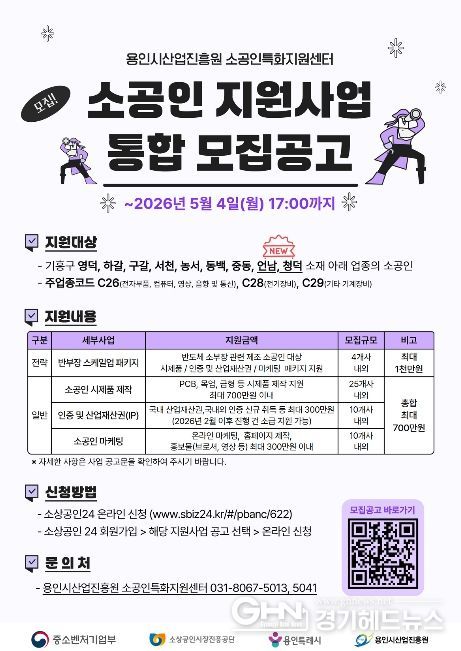 경기헤드뉴스 성미연 기자 | 용인시산업진흥원 소공인특화지원센터는 용인시 소재 소공인의 경쟁력 강화를 위해 소공인 지원사업을 본격 추진하고, 참여기업 총 49개사를 모집한다고 밝혔다.