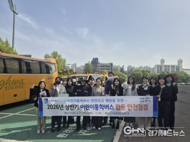 경기헤드뉴스 권준형 기자 | 수원특례시는 21일 수원종합운동장 주차구역에서 수원 장안·권선·팔달·영통경찰서, 한국교통안전공단과 함께 ‘2026년 상반기 어린이통학버스 합동 안전점검’을 했다.