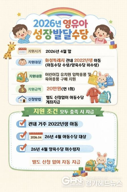 경기헤드뉴스 임수연 기자 | 화성특례시는 어린이집 및 유치원 입학 초기 영유아 가정의 양육 부담을 덜고 아동의 건강한 성장을 지원하기 위해 ‘2026년 영유아 성장발달수당’을 지급한다고 밝혔다.