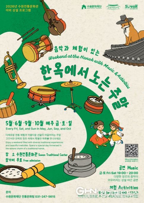 수원문화재단 관계자는 “‘한옥에서 노는 주말’은 한옥이라는 공간에서 음악과 체험을 함께 즐길 수 있는 프로그램이다”며 “이번 프로그램을 통해 시민들이 일상에서 자연스럽게 전통문화를 접하고, 특별한 주말의 추억을 만들 수 있기를 기대한다”고 밝혔다.