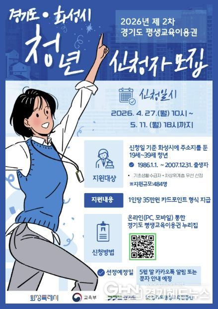 경기헤드뉴스 임수연 기자 | 화성특례시는 청년층의 자기계발과 역량 강화를 지원하기 위해 ‘2026년 평생교육이용권 지원사업’ 지역특화(청년) 분야 2차 이용자를 모집한다고 밝혔다.