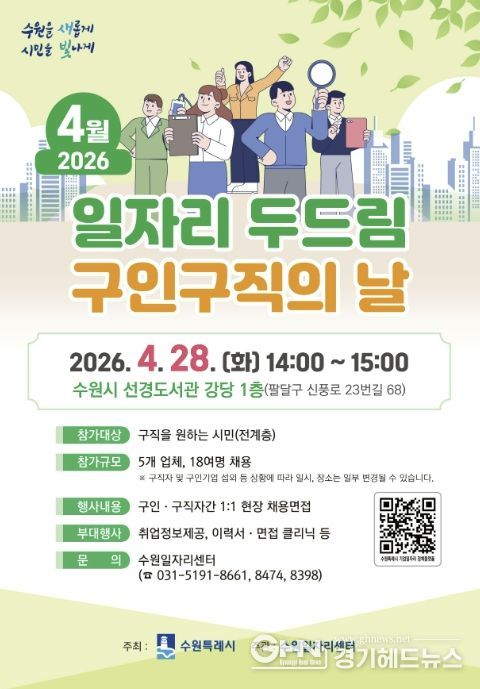 경기헤드뉴스 권준형 기자 | 수원특례시는 4월 28일 오후 2시부터 3시까지 선경도서관 강당에서 ‘4월 일자리 두드림 구인·구직의 날’을 개최한다.