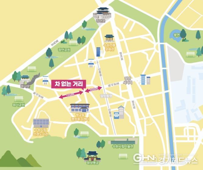 경기헤드뉴스 권준형 기자 | 수원시 행궁동 화서문로 34번지부터 신풍로 47번지까지 약 220m 구간이 5월부터 매주 토요일 ‘차 없는 거리’로 운영된다.