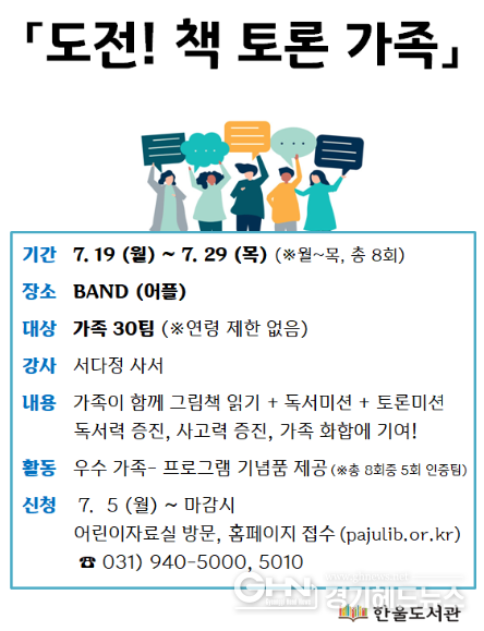 경기헤드뉴스 임채헌 기자 | 파주시 한울도서관은 19일~29일까지 가족팀을 대상으로 ‘도전! 책 토론 가족’을 운영한다.