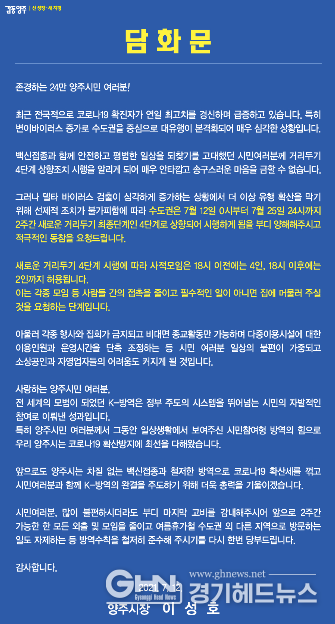 경기헤드뉴스 임채헌 기자 | 이성호 양주시장이 12일 사회적 거리두기 4단계 시행에 따른 ‘시민께 드리는 담화문’을 발표하며 외출 및 모임 자제 등 코로나19 확산을 막기 위한 방역수칙 철저 준수에 시민 여러분의 적극적인 협조를 당부했다.