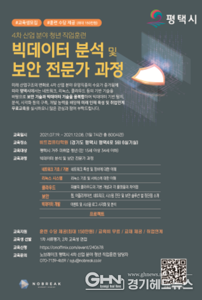 경기헤드뉴스 임채헌 기자 | 평택시는 4차 산업혁명 시대의 청년 인재 양성을 위해 전문 교육기관((주)노브레이크)과 함께 “빅데이터 분석 및 보안 전문가 과정”을 개설하고 훈련에 참여할 청년 교육생을 모집한다고 밝혔다.