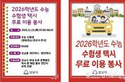 경기헤드뉴스 성미연 기자 | 성남시는 오는 11월 13일 ‘2026학년도 대학수학능력시험’이 치러지는 수능 당일, 지역 내 26개 시험장(465개 시험실)에서 시험을 치르는 1만2,533명의 수험생을 위해 특별 교통 대책을 시행한다. 개인택시와 법인택시 총 950여 대가 오전 7시부터 8시까지 ‘2026학년도 수능 수험생 택시 무료 이용 봉사’ 표지를 부착하고, 수험생을 대상으로 시험장까지 무료 운행 서비스를 제공한다. 수험생은 성남콜택시(031-755-4000)를 통해 택시를 호출하면 시험장까지 무료로 이동할 수 있다. 이마트성남점, 은행시장, 모란역 8번 출구, 성남종합버스터미널, 미금역 1번 출구 등 5곳의 주요 택시정류장에서는 수능 수험생이 무료 택시를 바로 탑승할 수 있도록 운영된다. 시는 수험생의 대중교통 이용 편의를 위해 등교 시간대인 오전 6시부터 8시 10분까지 광역·시내·마을버스 109개 노선을 집중 배차해 운행한다. 시험장 주변 교통 혼잡을 줄이기 위해 불법 주정차 차량에 대한 단속을 강화하고, 수험생 차량의 원활한 이동을 방해하는 경우 즉시 견인 조치할 예정이다.