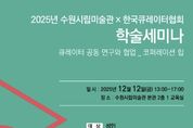 경기헤드뉴스 권준형 기자 | 경기도 수원시립미술관은 한국큐레이터협회와 함께 2025년 학술 세미나 '큐레이터 공동 연구와 협업-코퍼레이션 힙'을 주제로 12월 12일 오후 1시 수원시립미술관 행궁 본관에서 개최한다. 이번 세미나는 기관과 기획자 간 연구의 지평을 확장하는 담론의 장을 위해 수원시립미술관과 한국큐레이터협회가 업무협약을 체결하고 공동 연구와 협업 사례를 조명한다. 세미나는 “큐레이터 공동 연구와 협업-코퍼레이션 힙”을 주제로 김현숙 KISO미술연구소 소장이 한일 공동 연구 전시 사례로서 《한일 근대미술가들의 눈》의 연구 과정을 발표하며 세미나의 첫 문을 연다. 전북도립미술관 이애선 관장은 “빈손의 연대, 가득한 변화 – 연대는 선택이 아닌 책임”이라는 주제로 전라북도 소재 예술기관들의 협업과 연대 사례를 살펴보며, 이영준 김해문화관광재단 정책홍보팀장은 공동 연구와 협업 전시가 어우러진 사례로서 “문예회관 전시실, 협업과 연대로 풀어보는 대안들”을 발표한다. 2부에서는 한국화학연구원 고영주 전문경영위원이 “대전 과학예술 융합 사례”에 관한 연구를 공유하고, 박지영 독립큐레이터는 경남도립미술관에서 기획한 《실로