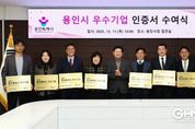 경기헤드뉴스 성미연 기자 | 용인특례시는 11일 시청 접견실에서 ‘2025년 용인시 우수기업 인증제’ 심의 결과 선정된 ‘올해의 우수기업’ 10개 사에 인증서를 전달했다. 이상일 용인특례시장은 이들 기업 대표와 임직원들을 만나 축하와 격려 인사를 나누고 우수기업 인증서와 현판을 전달했다. 이상일 시장은 “우리 경제가 어려운 가운데서도 기업 활동을 잘 해주셔서 우수기업으로 선정된 것을 축하드린다”며 “각자 분야에서 그동안 많은 노하우를 쌓아왔기에 경제가 어려운 가운데서도 성과를 냈고, 우리 지역 경제에도 큰 보탬이 돼 주셔서 감사드린다”고 말했다. 이 시장은 “기업 활동으로 한 가족의 가장은 힘을 얻어 가정을 잘 꾸려갈 수 있고, 신규 일자리를 찾는 사람에게는 희망을 주셨다”며 “기업인들이 활동하실 수 있도록 환경을 잘 개선해 나갈 것”이라고 했다. 시는 매년 경영 실적, 기술·품질 경쟁력, 지역사회 기여도 등 다양한 지표를 종합 평가해 지역경제 발전에 기여한 중소기업을 우수기업으로 인증하고 있다. 올해 선정된 기업은 ▲㈜대성티엠씨 ▲신명이엔씨㈜ ▲주식회사 에이드로 ▲㈜에이치에스씨엠티
