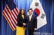 경기헤드뉴스 성미연 기자 | 4조 3천억 원 규모의 해외투자 유치와 청년 기회 확대를 위해 미국을 방문 중인 김동연 경기도지사가 약 3조 원 규모의 탄소 저감 친환경 복합물류센터를 조성하는 초대형 투자유치에 성공했다. 김 지사는 같은 날 5천억 원 규모의 반도체 산업용 가스 생산시설 투자 협약을 맺어 하루에 3조 5천억 원이라는 대규모 투자유치 성과를 기록했다. 김동연 경기도지사는 현지 시각 13일 오후 뉴욕 렉싱턴애비뉴에 위치한 ESR그룹 주주사이며 글로벌 사모주식펀드 회사인 W본사에서 ESR켄달스퀘어(주)와 투자유치 행사를 진행했다. 행사에는 남경순 경기도의회 부의장, 유대종 국제관계대사도 함께 했다. 김동연 지사는 “수소에너지를 기반으로 한 친환경 복합물류센터를 조성하면서 신기술·신산업을 실증․실험할 수 있는 테스트베드 효과도 얻을 수 있다”라면서 “단순 물류가 아니라 미래 유망 신산업을 이끌어갈 새로운 기회의 장이라는 점에서 좋은 인상을 받았다. 적극 지원하겠다”라고 덧붙였다. ESR켄달스퀘어(주) 남선우 대표는 “경기도와 협력해 이 프로젝트가 친환경에도, 지역 주민에도 경기도 경제에도 도움을 주는 사업이 되도록 적극 노력하겠다”라
