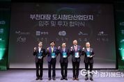 경기헤드뉴스 성미연 기자 | 부천대장공공주택지구 내 도시첨단산업단지에 SK그룹이 2027년까지 1조 원을 투자해 약 13만7천㎡(4만1천평) 규모의 차세대 배터리·반도체 소재, 탄소저감 등 친환경 기술개발 분야 연구개발(R&D)단지를 조성한다. 김동연 경기도지사와 조용익 부천시장, 이한준 한국토지주택공사(LH) 사장, 원명희 부천도시공사 사장, 김준 SK이노베이션 대표이사 부회장은 4일 오후 부천아트센터에서 이런 내용을 담은 ‘부천대장지구 내 제1도시첨단산업단지 조성사업 입주 및 투자 협약’을 체결했다. 김동연 지사는 “지난 주 광명에서 기후도지사가 되겠다고 이야기를 했다. 경기도는 공공과 기업, 도민생활과 산업, 4가지 측면에서 14개 과제를 가지고 기후대응을 하고 있는데 그중에서 공공 RE100 실천과 산업집적단지에 대한 RE100을 중앙정부나 어떤 지방정부보다 선도적으로 하고 있다”며 “이런 가운데 그린테크노캠퍼스가 부천에 둥지를 틀게 돼 대단히 기쁜 마음을 금할 수 없다”고 말했다. 그러면서 “그린테크노캠퍼스 유치를 계기로 경기도, 나아가 대한민국 성장을 견인하는 데 함께 힘을 모으도록 하겠다. 경기도와 부천시는 이번에 만들어지는 SK그린테크노