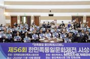 경기헤드뉴스 임수연 기자 | 용인특례시는 10일 시청 컨벤션홀에서 민족통일 용인특례시협의회 주관으로 ‘민족통일 용인특례시대회와 제56회 한민족통일문화제전 시상식’이 열렸다고 밝혔다. 이날 행사는 한반도의 평화와 통일을 주제로 한 글짓기·웹툰·포스터·사진 공모전의 입상작을 시상하고, 유공회원에게 표창을 수여하고자 마련됐다. 민족통일 용인특례시협의회는 1981년 창립한 단체로 매년 태극기 나눔을 비롯해 지역사회 통일운동 의식 제고 등을 위한 다양한 활동을 벌이고 있다. 이날 협의회는 홍보자료 시청, 통일 관련 동영상과 남북 언어 차이에 대한 학습자료를 시청하고 간단한 통일 퀴즈대회를 거쳐 우수 작품 3개를 낭독했다. 이어진 시상식에서는 용인특례시장상 3명 등 총 36명이 수상의 영예를 안았다. 유한종 민족통일 용인특례시협의회장은 “민족의 염원인 한반도 평화통일을 위해 어려운 여건 속에서도 적극 지원해 주시는 이상일 시장님께 감사드린다”며 “대한민국 통일의 그 날이 올 때까지 협의회 회원의 뜻을 한데 모아 더욱 적극 활동하겠다”고 했다. 이상일 시장은 “대한민국이 한국전쟁의