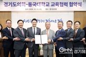 경기헤드뉴스 성미연 기자 | 경기도의회는 23일 오전 의장 접견실에서 동국대학교와 교육협력 및 학술교류를 위한 업무협약(MOU)을 체결했다. 이날 협약식에는 김진경 의장(더민주, 시흥3)과 고준호 의원(국민의힘·파주1), 김완규 의원(국민의힘·고양12), 이병숙 의원(더민주·수원12), 박호순 의정국장이 참석했다. 동국대학교에서는 윤재웅 총장, 김용현 교무부총장, 김승용 대학원장, 유한림 BMC(바이오메디캠퍼스) 행정처장 등이 함께 자리해 협약의 의의를 더했다. 양 기관은 이번 협약을 계기로 ▲의정 발전을 위한 정보 교류 ▲전문 인재 양성을 위한 교육·연구 지원 ▲도의원 및 의회 직원 대상 대학원 장학금 지원 등 의정 활동 역량 강화를 위한 체계적인 교육 협력에 나서기로 했다. 윤재웅 총장은 “대학의 교육·연구 역량을 공유함으로써 경기도 발전에 기여할 수 있게 되어 뜻깊다”며 “경기도의회와의 지속적인 협력을 통해 실효성 있는 교육 지원을 이어갈 수 있도록 최선을 다하겠다”라고 말했다. 김진경 의장은 “의회에 대한 도민의 기대는 점점 더 복잡해지고 다양화되고 있는 만큼 의회 구성원 모