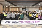 경기헤드뉴스 권준형 기자 | 성남시는 폭설에 대응하기 위해 수정, 중원, 분당 등 구별로 시민들이 참여하는 제설봉사단을 구성해 운영하고 있다고 18일 밝혔다. 이를 위해 수정구는 지난 12월 16일 오후 2시 구청 1층 대회의실에서 수정경찰서와 합동 대책회의를 하고, 제설봉사단 발대식을 개최했다. 수정구는 경찰과의 합동 대책회의 자리에서 지난 12월 4일 단시간에 집중된 폭설 당시의 현장 대응체계를 점검하고, 도로 교통혼잡과 안전사고 발생을 최소화하기 위한 기관 간 협력 방안과 대응 매뉴얼을 논의했다. 이어진 수정구 제설봉사단 발대식엔 전체 단원 1122명 가운데 100명이 참석해 폭설로 인한 주민 불편을 최소화하고 적극적인 제설 자원봉사 활동에 참여할 것을 다짐했다. 제설봉사단은 강설 시 이면도로 경사로, 보도, 육교 등 제설 취약 지역에 우선 투입된다. 전경만 수정구청장은 “제설봉사단은 제설 작업 이외에도 ‘내 집 앞, 눈 치우기’를 주변에 적극적으로 홍보해 주민들의 관심과 협조를 이끌어 내는 역할도 중요하다”면서 “민‧관‧경의 유기적인 협력을 통해 주민들이 안전하게 겨울을 날