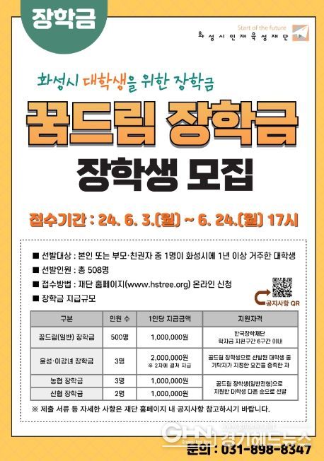 접수기간은 3일 9시부터 24일 17시까지로, 화성시인재육성재단 홈페이지에서 신청할 수 있다. 자세한 사항은 화성시인재육성재단 홈페이지에서 확인할 수 있으며, 장학사업팀으로 문의하면 된다.