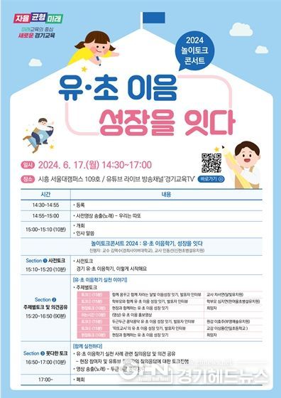 경기헤드뉴스 성미연 기자 | 경기도교육청이 17일 유ㆍ초 이음교육 실천과 공유의 장을 마련하고자 ‘2024 놀이토크콘서트’를 개최한다.