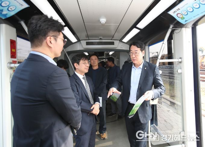 이날 정명근 화성시장과 동탄도시철도(트램) 건설사업 담당 공무원들은 한국철도기술연구원 관계자를 만나 무가선 트램 시스템에 대한 설명을 듣고 트램 시험선을 직접 시승했다