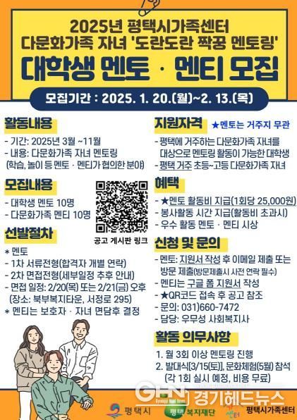 경기헤드뉴스 성미연 기자 | 평택시가족센터는 1월 20일부터 2월 13일까지 다문화가족 자녀 대상 ‘도란도란 짝꿍 멘토링’에 참여할 대학생 멘토와 멘티를 모집한다.