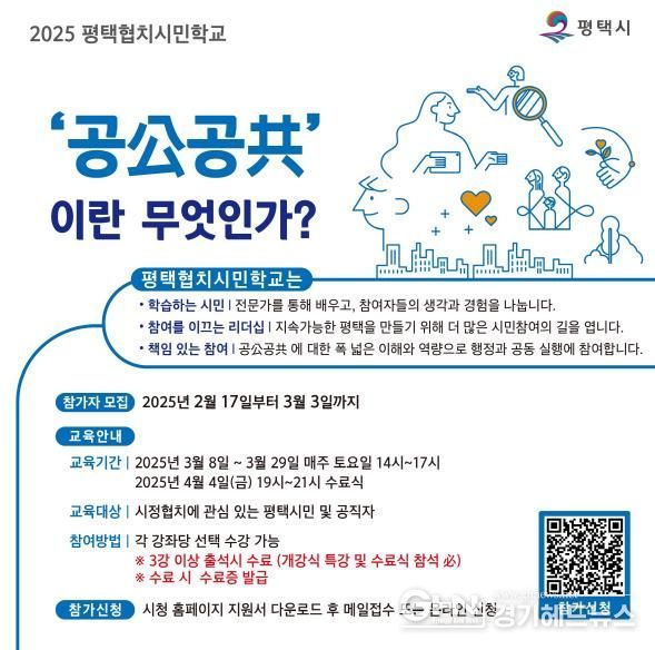경기헤드뉴스 성미연 기자 | 평택시는 오는 3월 3일까지 ‘2025 평택협치 시민학교’ 교육 참가자를 모집한다고 밝혔다.