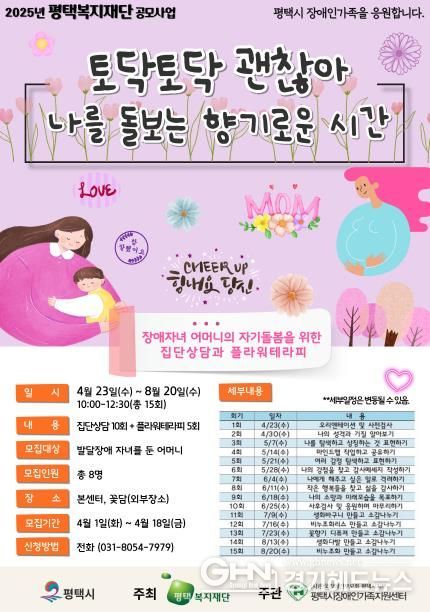 경기헤드뉴스 성미연 기자 | 평택시장애인가족지원센터에서는 4월 1일부터 18일까지 발달장애 자녀를 둔 어머니를 위한 ‘토닥토닥 괜찮아, 나를 돌보는 향기로운 시간’ 참여자를 모집한다.