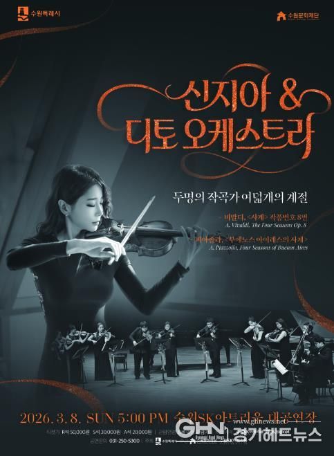 수원문화재단은 비발디와 피아졸라의 명작 ‘사계’를 한 무대에서 만나는 '신지아&디토오케스트라'를 오는 3월 8일 일요일 오후 5시 수원SK아트리움에서 개최한다.