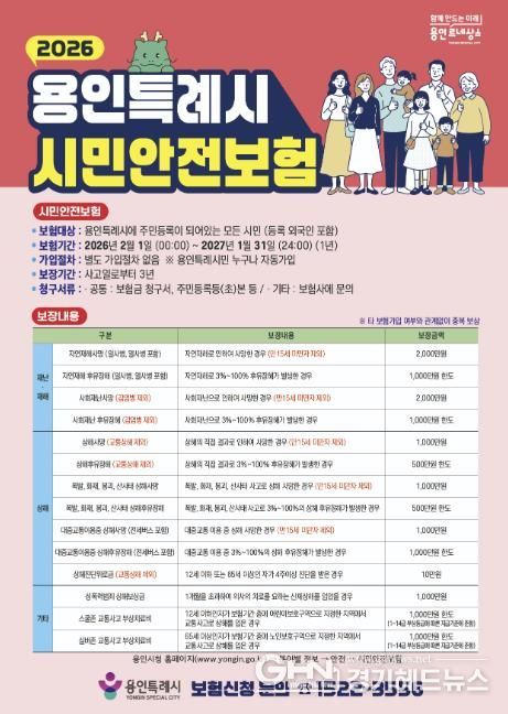 경기헤드뉴스 성미연 기자 | 용인특례시는 각종 재난과 사고로 피해를 본 시민의 생활 안정을 지원하기 위해 시민안전보험에 가입했다고 2일 밝혔다.