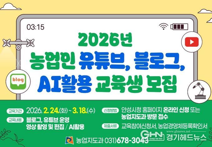 경기헤드뉴스 이현규 기자 | 안성시농업기술센터는 지역 농업인의 디지털 매체 활용 능력을 높이고 농산물 홍보 역량을 강화하기 위해 ‘2026년 농업인 유튜브·블로그·AI 활용 교육’ 교육생을 모집한다. 이번 교육은 블로그 운영뿐만 아니라 인공지능(AI)과 유튜브 동영상을 접목한 실전형 교육 과정으로 구성됐다.