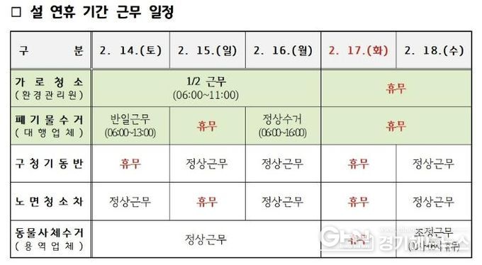 장안구 관계자는 “설 연휴 기간에도 청소 공백이 발생하지 않도록 철저히 대비하고 있다”며 “구민 여러분께서도 쓰레기 배출일과 배출 방법을 준수해 쾌적하고 즐거운 명절을 함께 만들어 주시길 바란다”고 말했다.