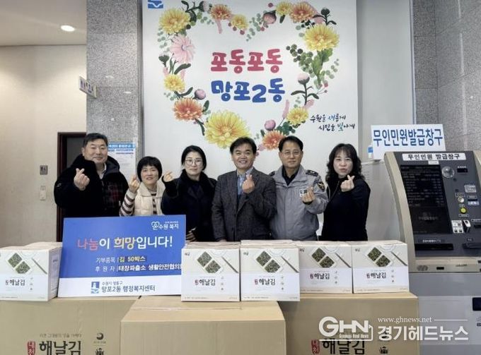 경기헤드뉴스 권준형 기자 | 영통구 망포2동 행정복지센터는 지난 2일, 태장파출소 생활안전협의회가 설 명절을 맞아 저소득 가정을 지원하기 위해 김 50박스를 망포2동 행정복지센터(동장 이용태)에 기탁했다고 밝혔다.