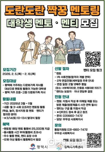 경기헤드뉴스 이현규 기자 | 평택시가족센터는 2월 5일부터 19일까지 다문화가족 자녀 대상 ‘도란도란 짝꿍 멘토링’에 참여할 대학생 멘토와 멘티를 모집한다.