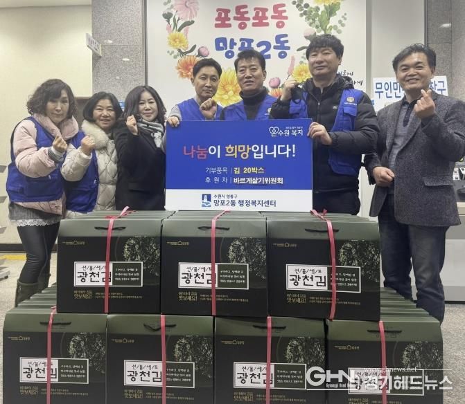 경기헤드뉴스 권준형 기자 | 영통구 망포2동 행정복지센터는 지난 6일 망포2동 바르게살기위원회가 관내 저소득 가정을 지원하기 위해 김 20박스를 기탁했다고 밝혔다.