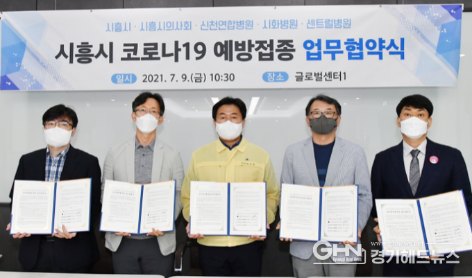 이날 시흥시의사회, 시화병원, 센트럴병원, 신천연합병원은 시흥시 코로나19 예방접종사업의 안전하고 성공적인 추진을 위해 상호협력체계에 적극 동참할 것을 협약했다.