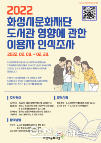 경기헤드뉴스 성미연 기자 | 화성시문화재단 도서관에서 시민을 대상으로 도서관의 사회적 영향에 관한 이용자 인식 조사를 2월 8일부터 2월 28일까지 시행한다.