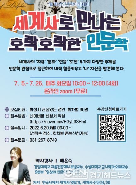 7월 화성인문학아카데미는 ‘세계사로 만나는 호락호락한 인문학’이라는 주제로 7월 5일부터 4주간 매주 화요일 오전 10시부터 12시까지 쌍방향 온라인 줌(zoom)으로 진행된다.