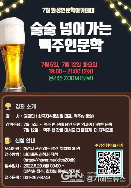 7월 화성인문학아카데미 야간 강좌는 ‘술술 넘어가는 맥주 인문학’이라는 주제로 7월 5일, 12일 저녁 7시부터 9시까지 쌍방향 온라인 줌(zoom)으로 진행된다.
