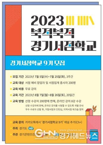 경기헤드뉴스 성미연 기자 | 경기도와 경기콘텐츠진흥원이 7월 5일부터 25일까지 서점 예비 창업자와 업계 종사자를 위한 ‘2023 북적북적 경기서점학교’ 교육생을 모집한다.