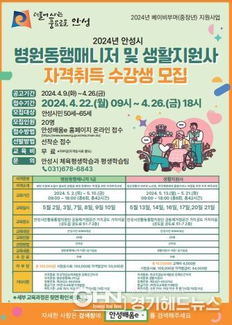 경기헤드뉴스 성미연 기자 | 안성시는 초고령사회 새로운 성장동력으로 자리매김하고 있는 베이비부머의 안정적이고 주체적인 삶의 지속을 위해 ‘베이비부머(중장년) 인생2막을 위한 자격취득 찾기’ 수강생을 모집한다.