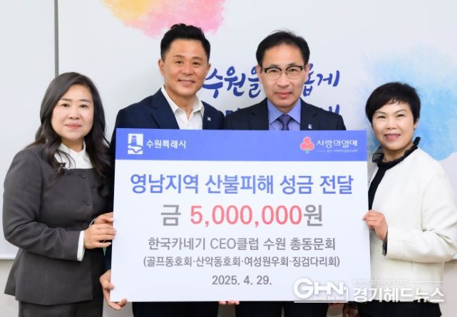 경기헤드뉴스 성미연 기자 | 한국카네기 CEO클럽 수원 총동문회가 “영남지역 산불피해 지원에 사용해 달라”며 수원시에 500만 원을 기탁했다.
