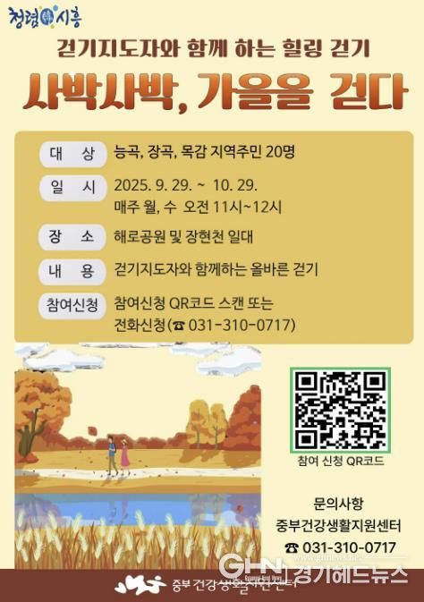 경기헤드뉴스 성미연 기자 | 시흥시에서는 9월 29일부터 10월 29일까지 매주 월ㆍ수요일 오전 11시부터 12시 능곡동 해로공원 및 장현천 일대에서 ‘사박사박 가을을 걷다’ 프로그램을 운영한다.